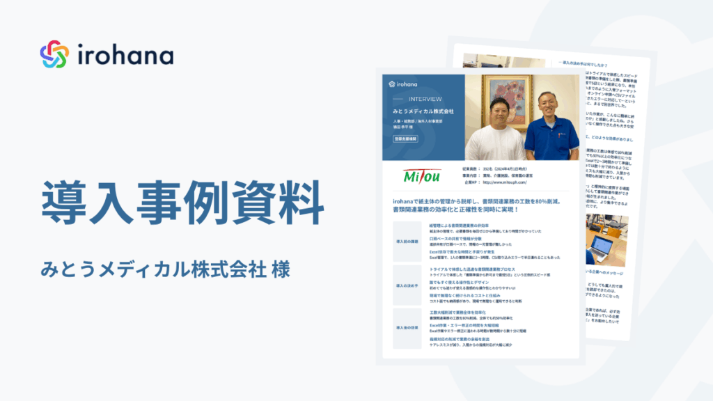 みとうメディカル株式会社様に、irohanaを導入する前に抱えていた課題や不安、導入を決めたきっかけ、そして導入後に感じられた変化や効果についてお話を伺いました。