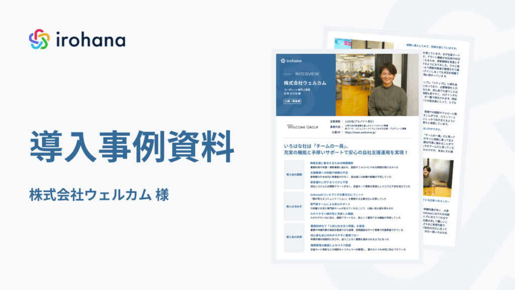 株式会社ウェルカム様に、irohanaを導入する前に抱えていた課題や不安、導入を決めたきっかけ、そして導入後に感じられた変化や効果についてお話を伺いました。
