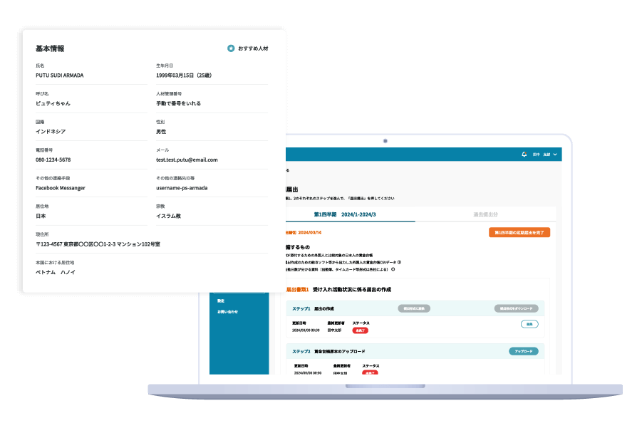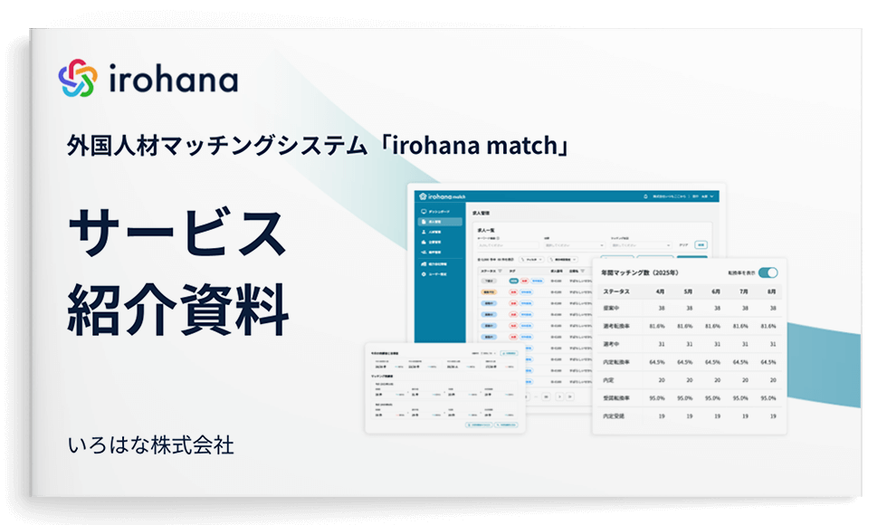 マッチングで内定した外国人材の情報は、再入力不要で「irohana visa」と連携。紹介業務から在留資格関連書類の管理までを一気通貫でつなぎ、転記ミスや業務分断を防ぎます。