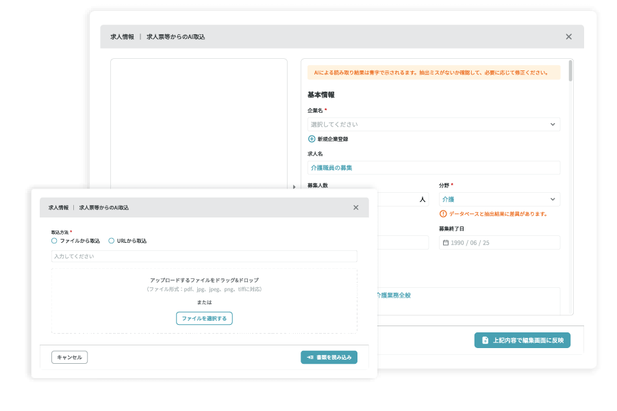 企業から受領した求人票をアップロードするだけで、AIが職種・条件・勤務地などを自動で読み取り登録。入力作業や転記ミスを削減し、スピーディーにマッチング業務へ移行できます。