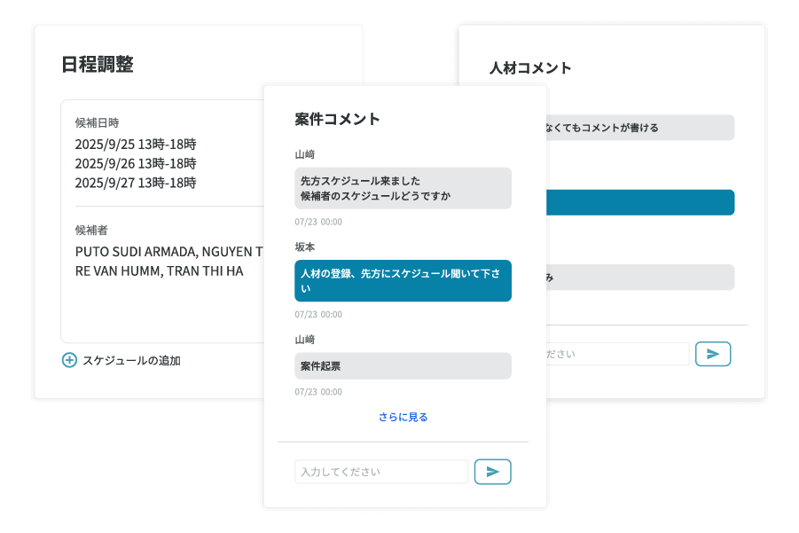 人材×企業ごとのマッチング単位で、連絡履歴・進捗・対応状況を一元管理。複数案件を並行しても混乱せず、連絡漏れや対応遅れを防ぎ、成約率と顧客満足度を高めます。