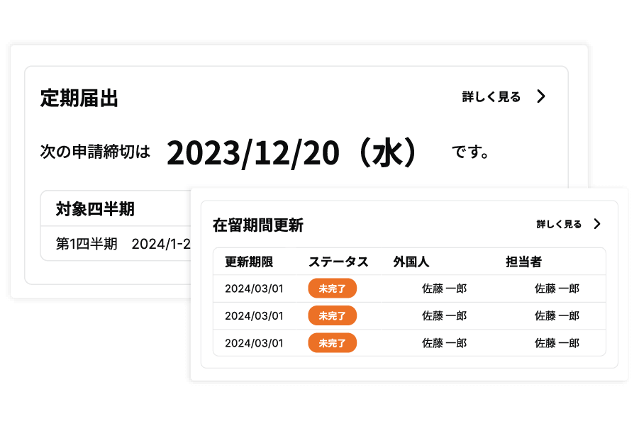 在留期限の4か月前から定期的にアラートメールを送信し、パスポート期限や書類提出の遅れを可視化。期限管理が難しくなりがちな状況でも、抜け漏れを抑えて運用を安定化できます。