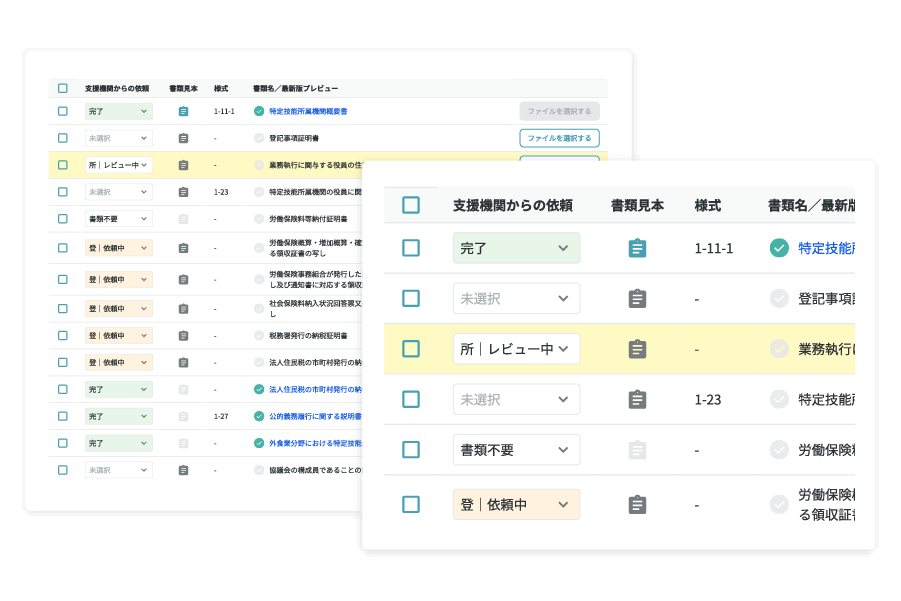 所属機関・本人・送出し機関などの、多方面にまたがる書類収集状況を一画面で確認可能。オンライン提出依頼も行えるため、連絡や確認の手間を削減できます。